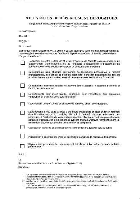 L’attestation de déplacement dérogatoire entre 20h et 6h.