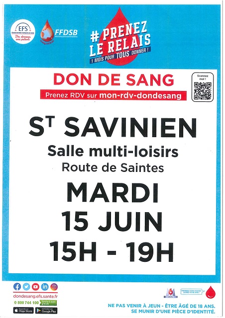 lundi 27 janvier 15h -19h à Saint Savinien ( salle multi-loisirs)