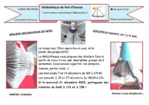 Atelier déco de Noël 15 Juil, 2025 12/07/2022Atelier déco de Noël16 h 00 min - 17 h 30 minouvert à tous, de 16h00 à 17h30 à la Médiathèque Evénements
