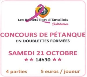 Concours de pétanqueorganisé par les Boulets port d'envallois au profit de la Ligue contre le cancer à 14h30 06 31 97 26 76-06 12 27 29 43