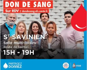 Don de sang 15 Juil, 2025 09/25/2023Don de sang15 h 00 min - 19 h 00 minSaint Savinien 15h-19h - salle multi-loisirs General